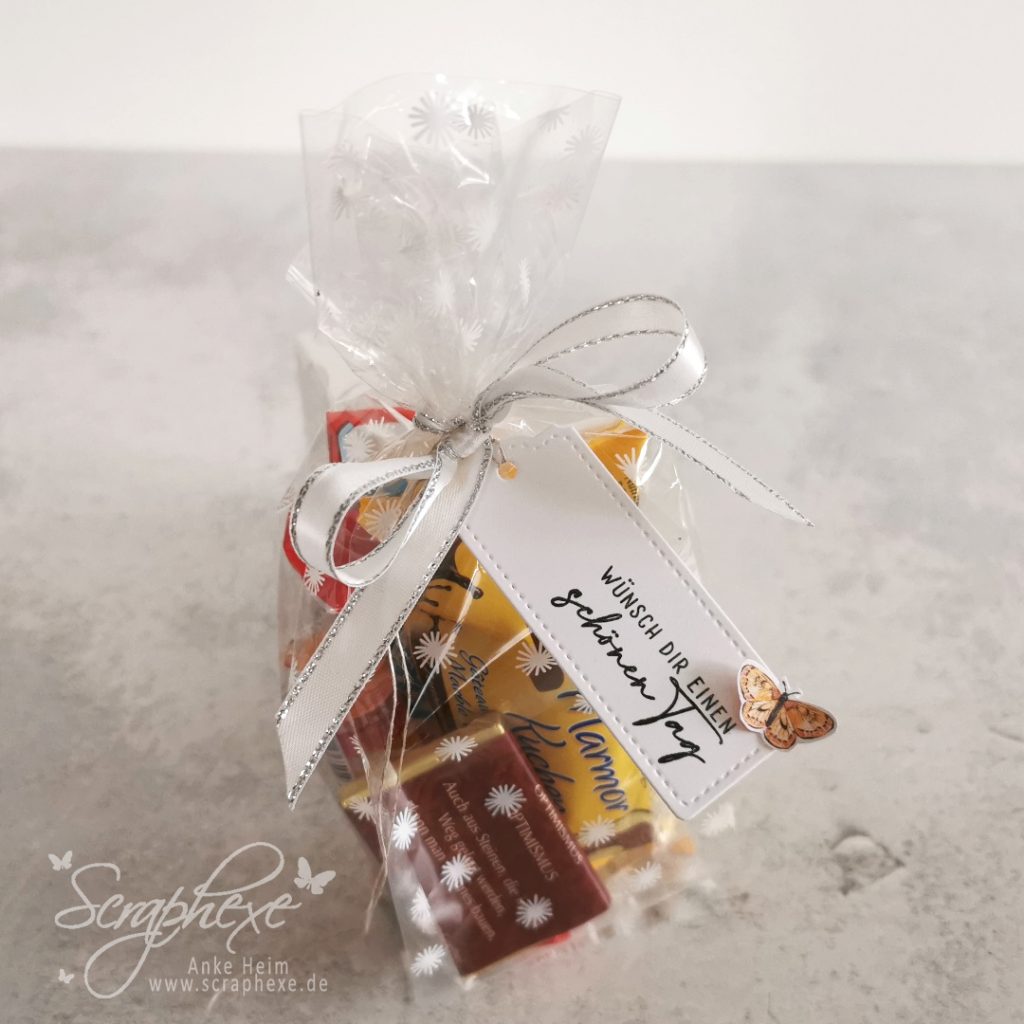 Mit dabei waren neben Schoki und Gummi“bärchen“ auch ein Minikuchen und ein Teebeutel für die „Kaffeepause“. Nett verpackt in einem kleinen Tütchen mit dem Anhänger. Wir hoffen, dass auch alle, die ihr Materialpaket allein und nicht mit uns gemeinsam online gewerkelt haben, einen schönen Tag mit dem Paket hatten.