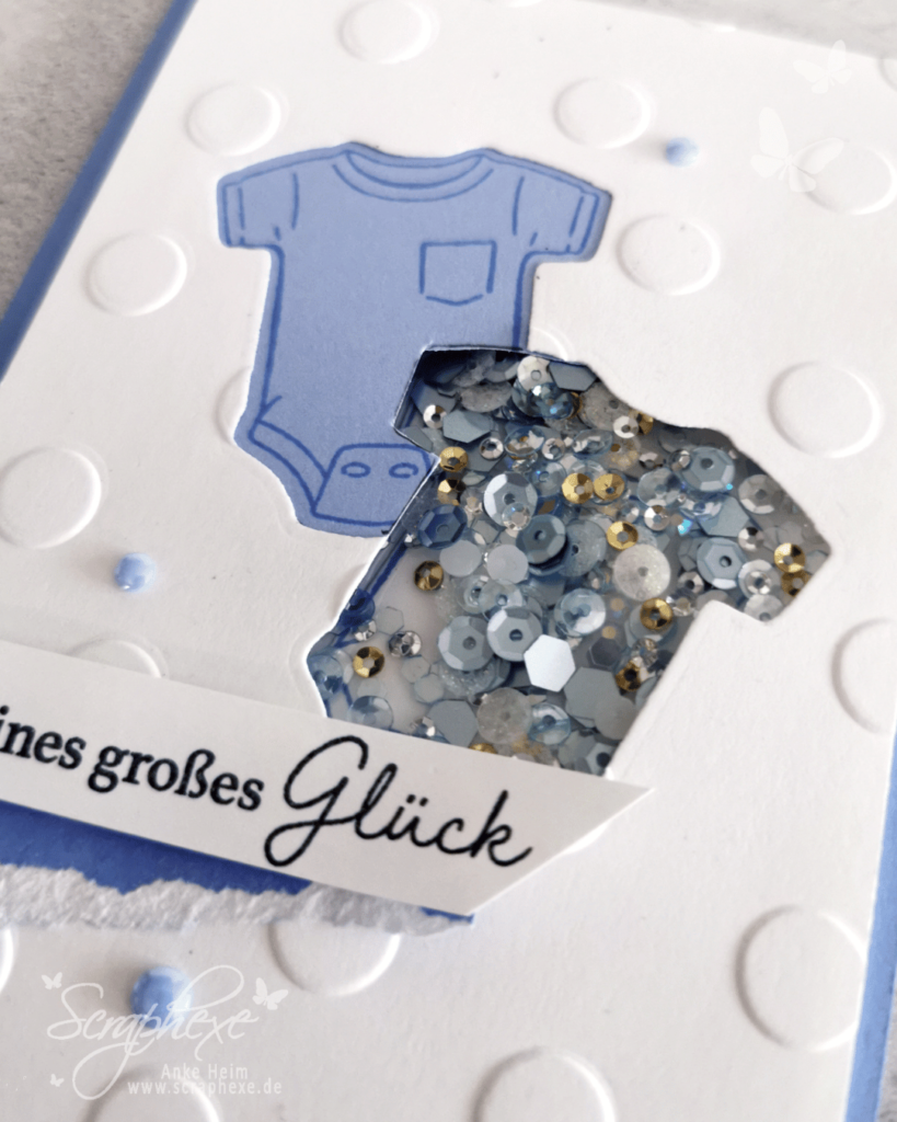 Den grundweißen Farbkarton habe ich mit Punkten geprägt. Ich glaub, das war eine meiner ersten Stampin‘ Up!-Prägeformen. Aber hier passte sie einfach toll. In den Aufleger habe ich zwei Mal den Body gestanzt. Einmal hinterlegt mit einem Stempelmotiv, beim anderen ist das Schüttelelement dahinter.
