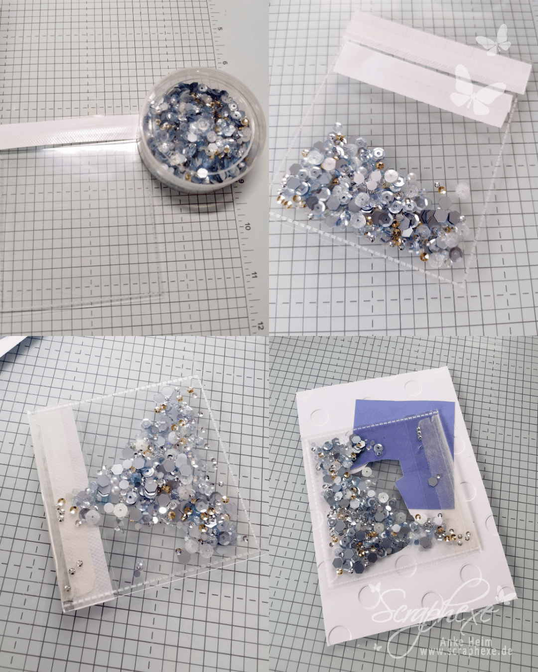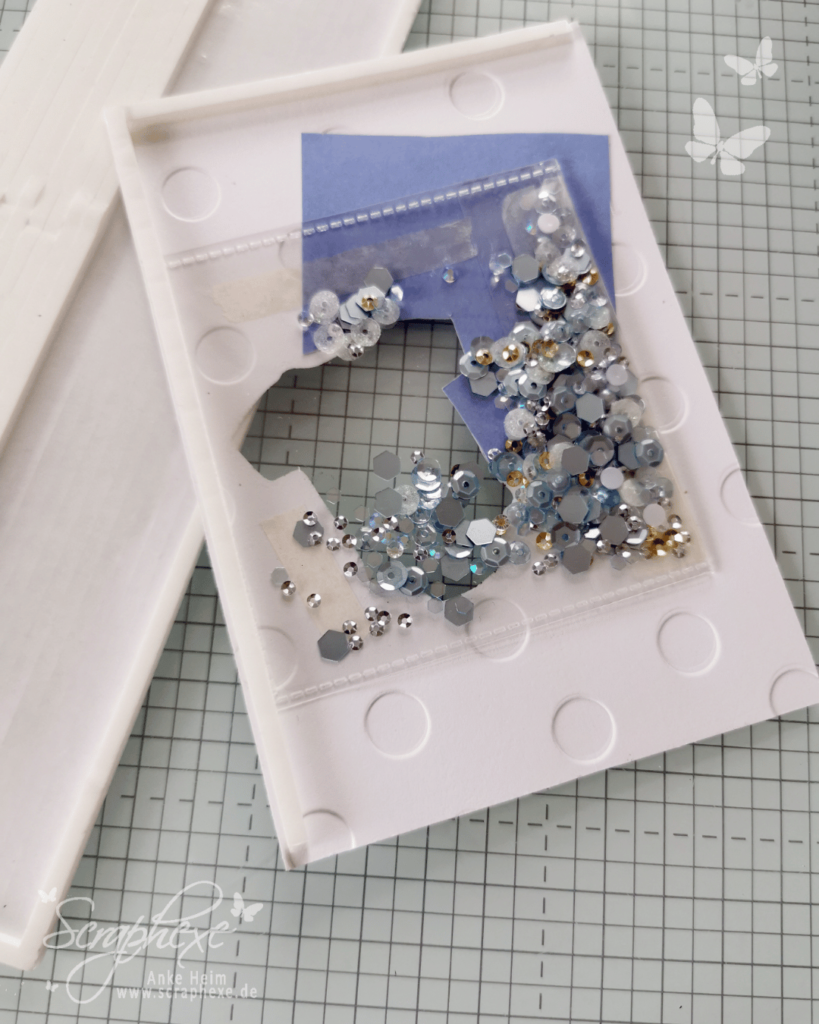 Um dem Schüttelelement genug Platz zu geben, habe ich rings um den Aufleger die Schaumstoffklebestreifen geklebt. So ist auch eine geschlossene Kante um das Element und man kann nicht darunter schauen. Dichter aufgeklebt, beult das Schüttelmaterial sicher auch die Karte.