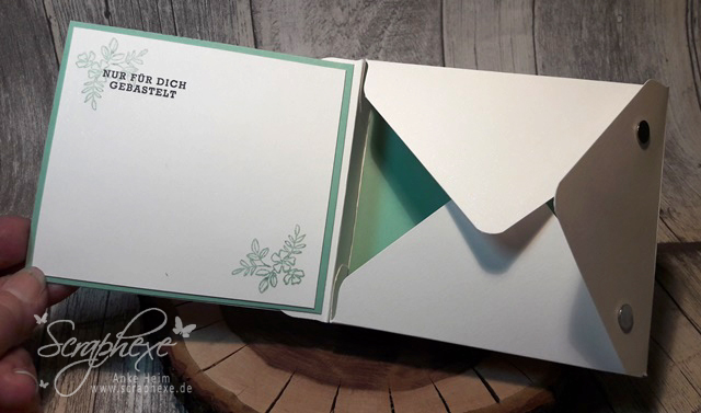 Der Zuschnitt für die Grüße ist auch 9,5 cm x 9,5 cm und der Zuschnitt minzmakrone für den Boden ist 9,9 cm x 9,9 cm (in meinem Fall natürlich auf das „falsche“ Maß der Box angepasst). Und da sich tatsächlich noch ein Stempelkissen in minzmakrone in meinem Stempelkissenregal geschlummert hat, konnte ich die Blümchen innen auch farblich passend stempeln.